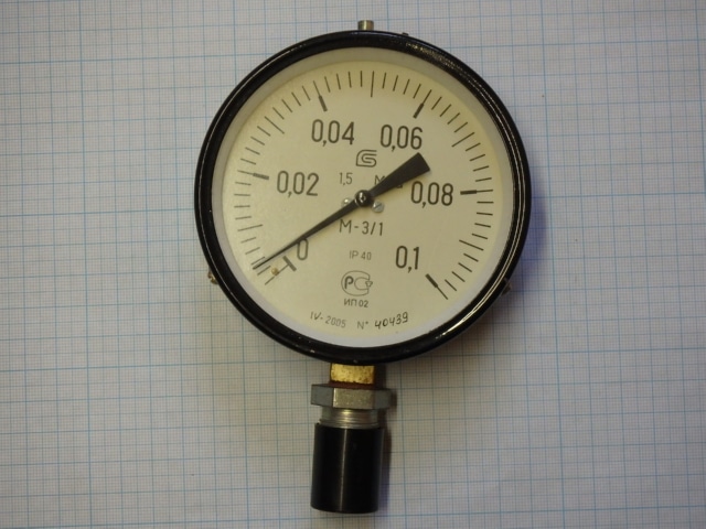 Манометр М-3/1 0-0.1МПа IP40 2005г.в класс точности 1.5 диаметр Ф100мм штуцер М12х1.5 с установленным переходником М20х1.5 цена товара 2.5евро указана за одну штуку 1шт