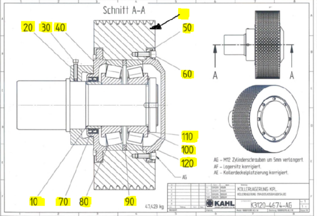 Бегун цельный ролик в сборе с подшипниковой опорой KAHL K3120-8170 пресса гранулятора сухого жома KAHL PRESSE 39-1000 цена товара 3865евро указана за одну штуку 1шт